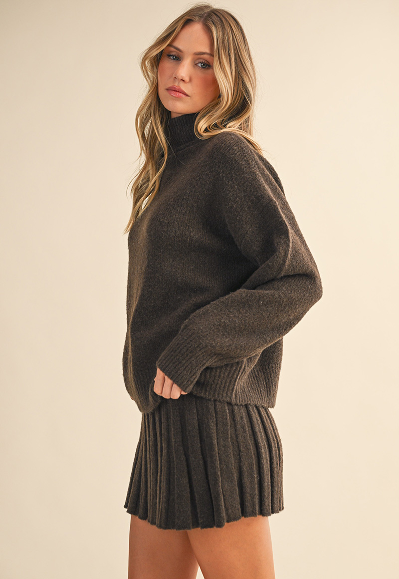 Turtleneck pullover sweater with pleated mini skirt.