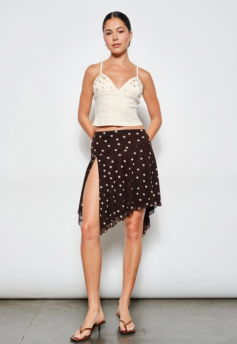 Cream button tank with adjustable straps.