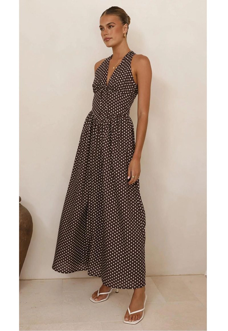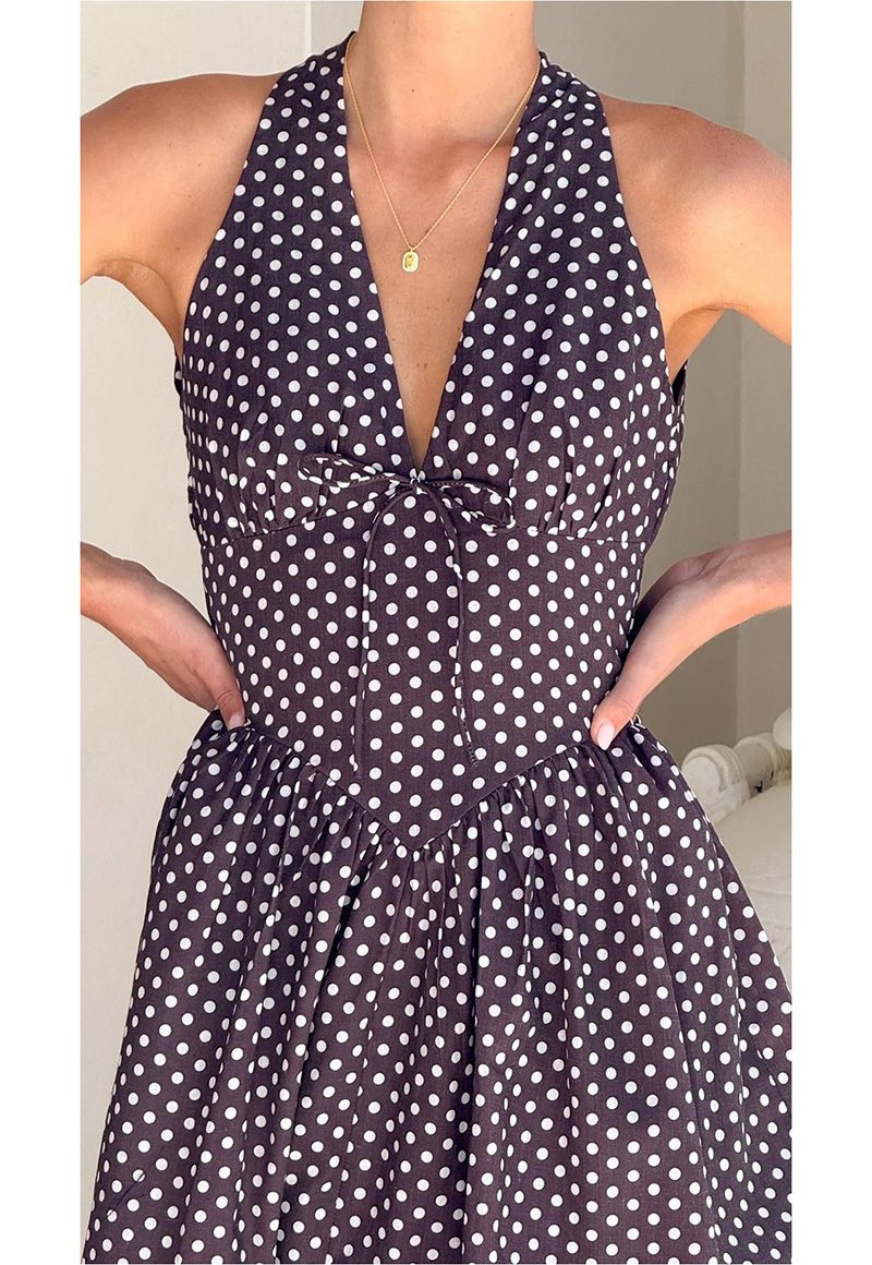 Brown polka dot dress with a back zipper. Lined.