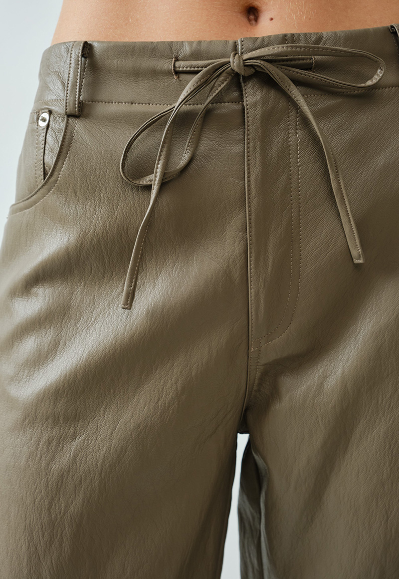 Super soft brown faux leather straight pants. Drawstring waist. Relaxed fit.