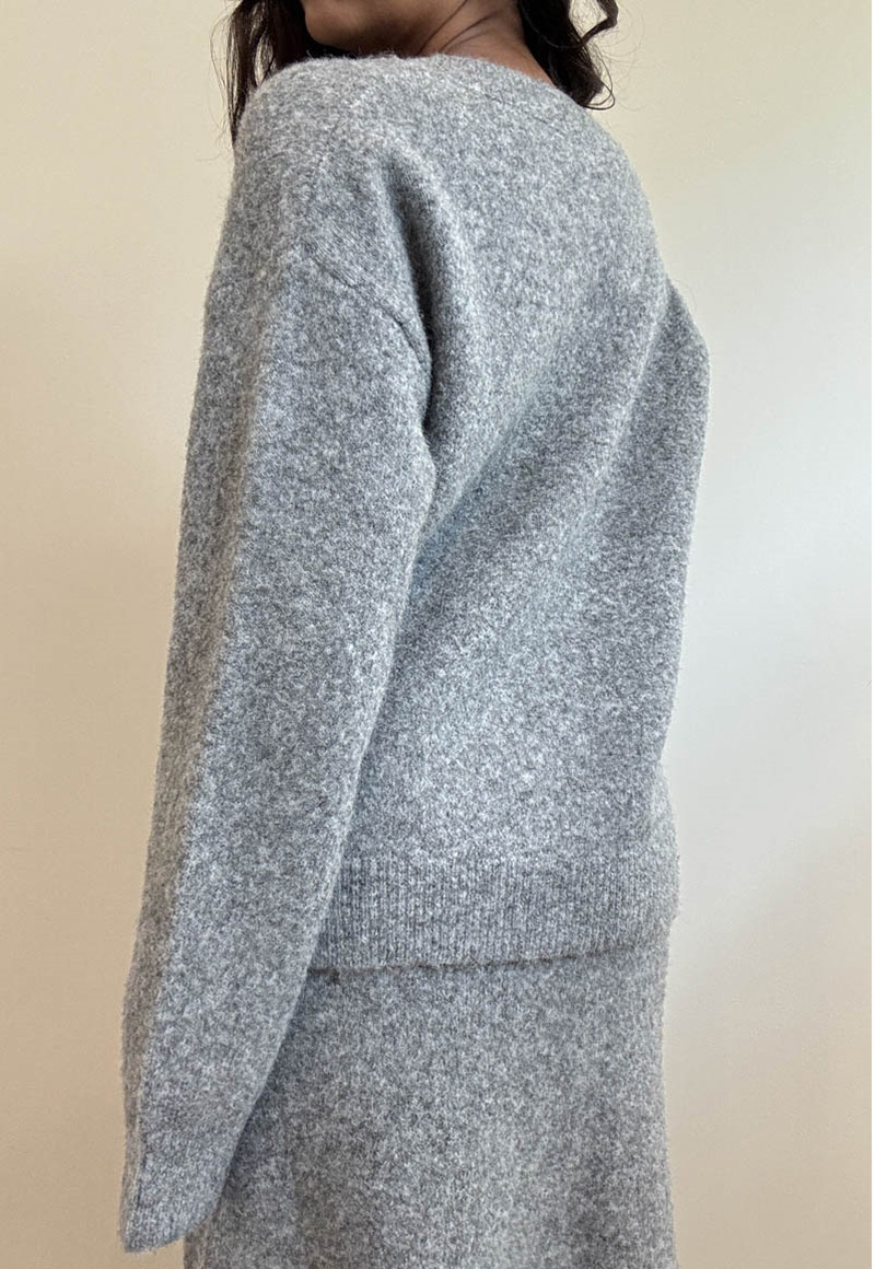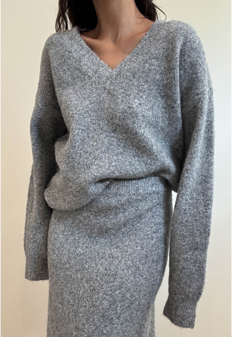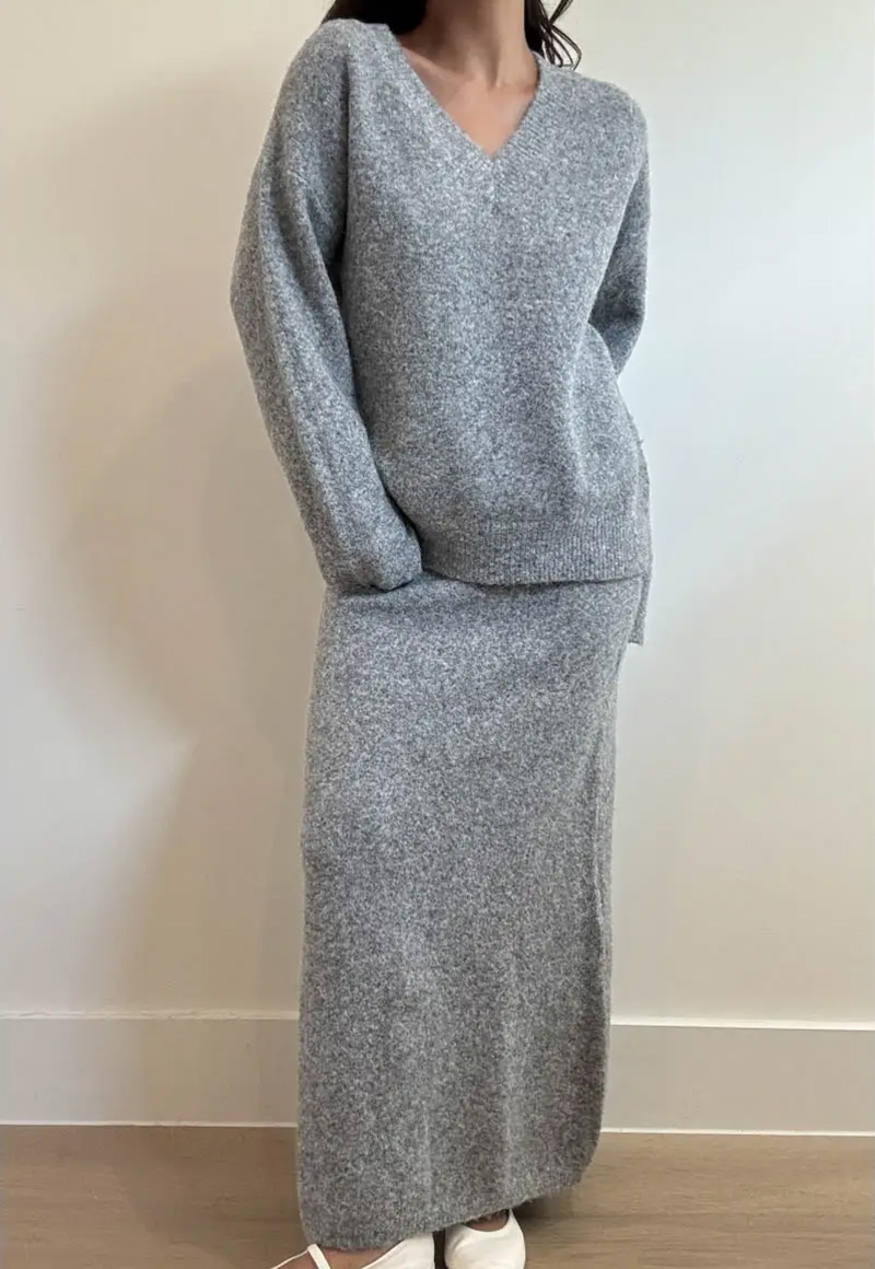 Grey soft sweater set. Includes v-neck sweater with long maxi skirt. Elastic waistband.