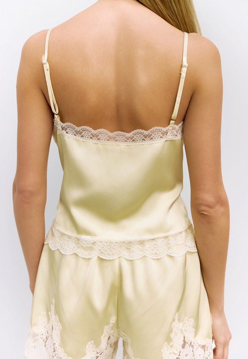 Lemon satin lace cami with adjustable straps.