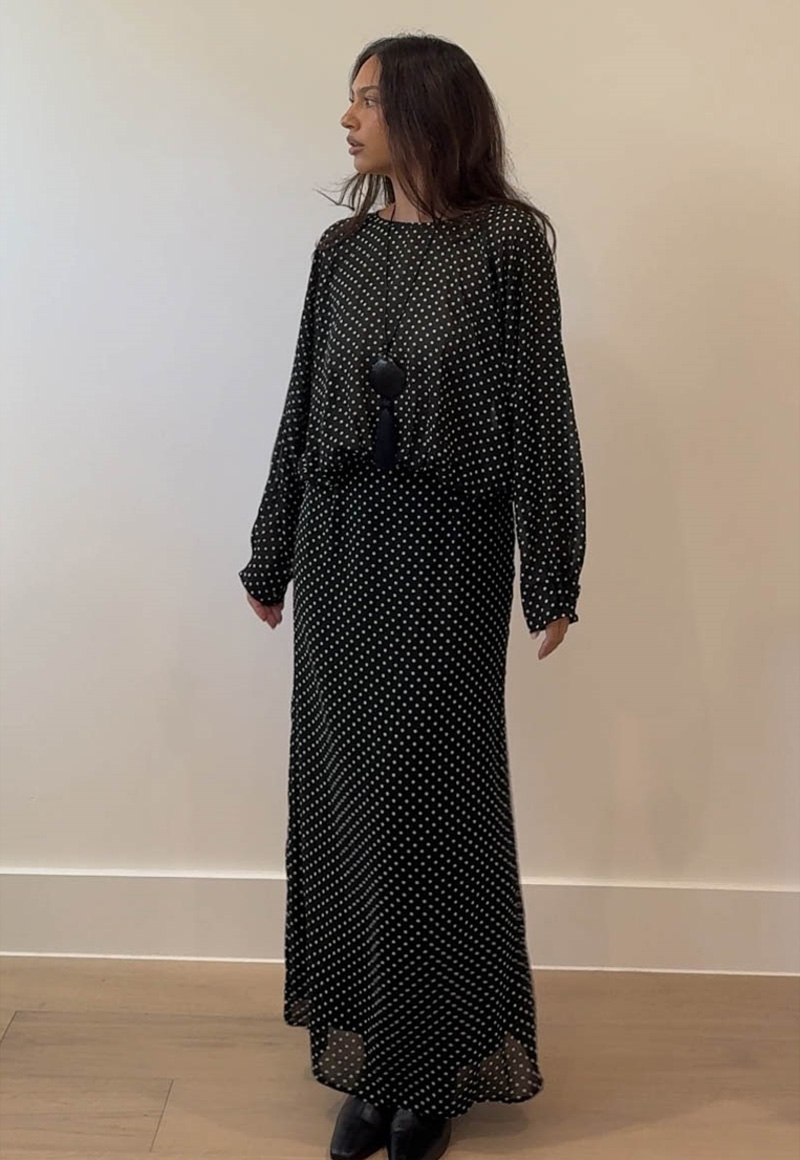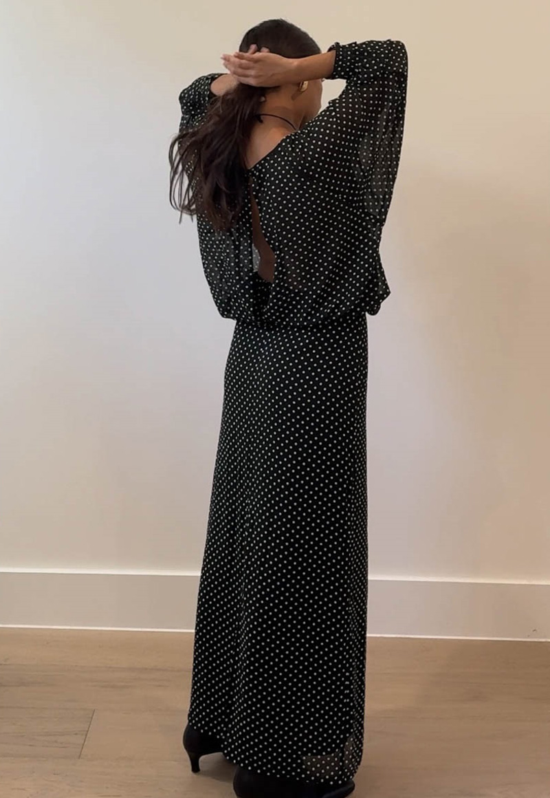Black polka dot blousy dress with a back zipper and open back. Lined.