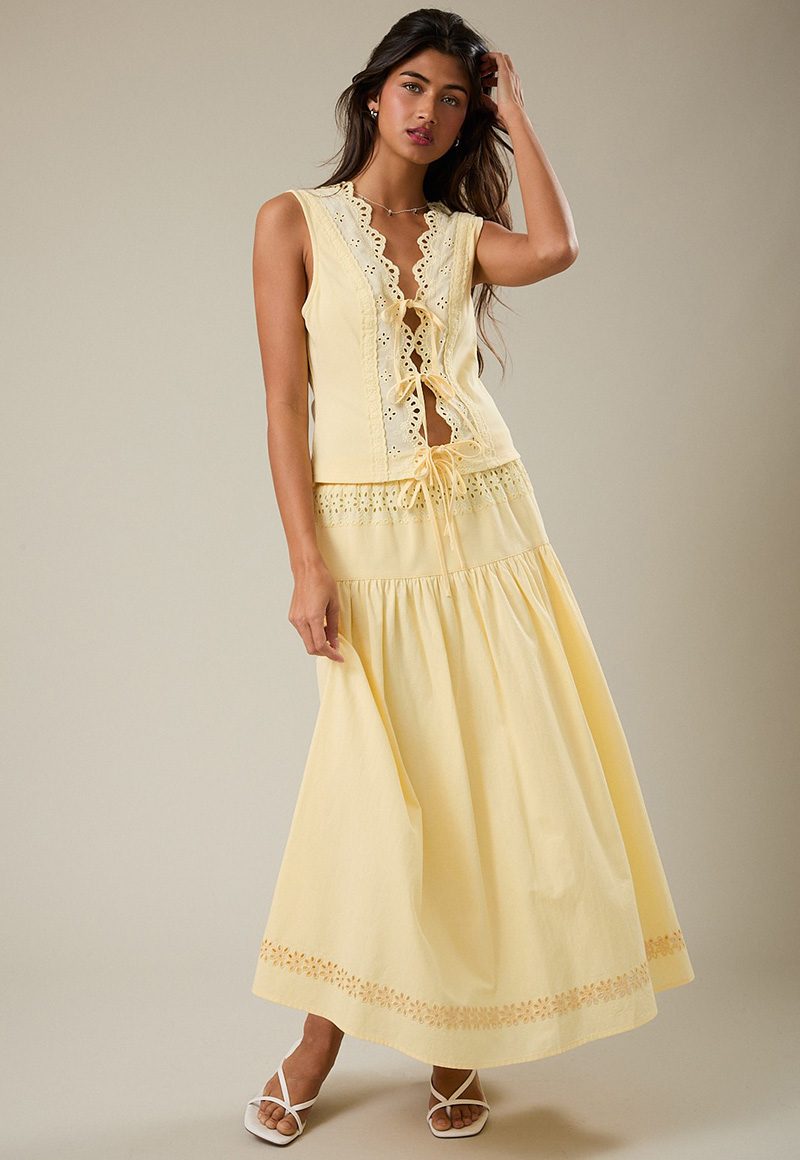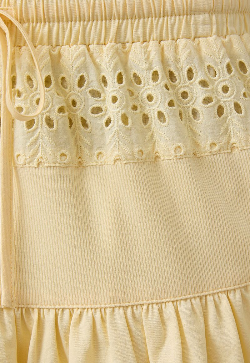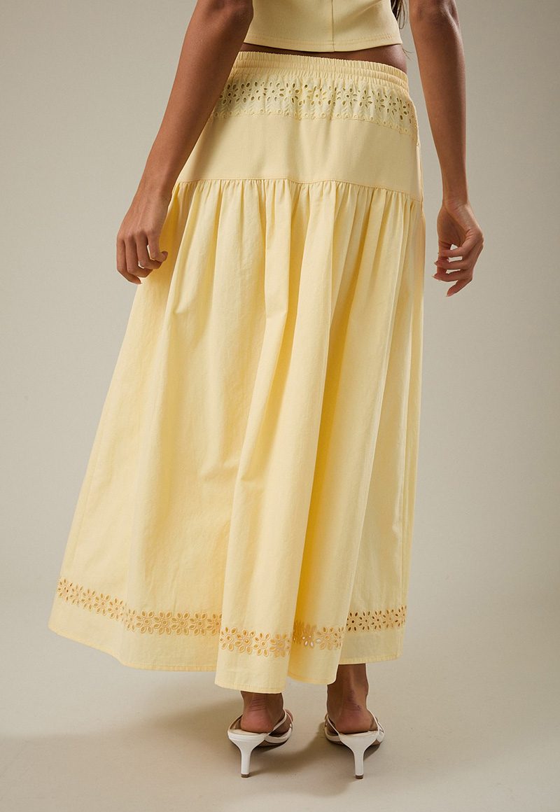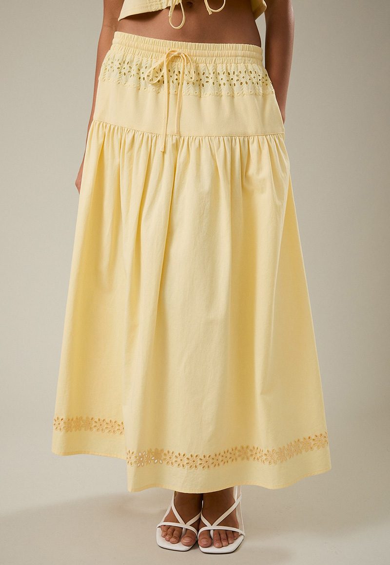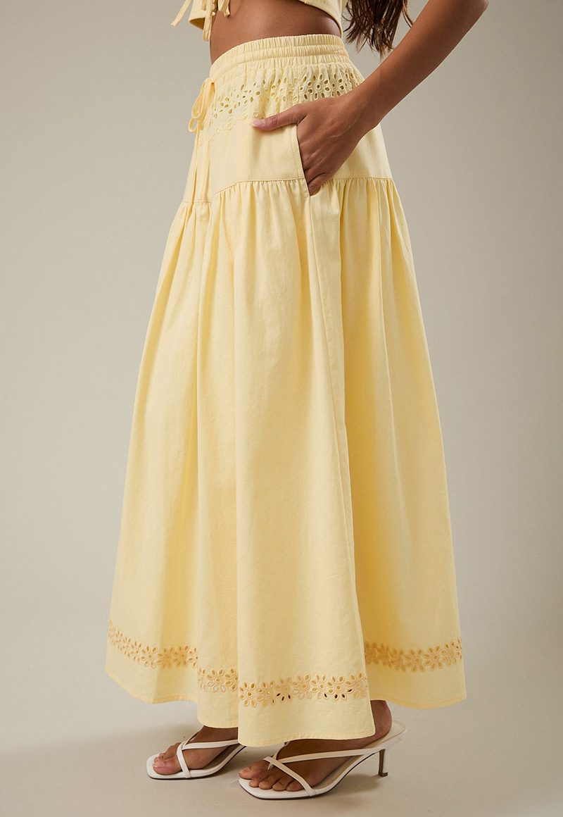 Yellow eyelet skirt with elastic band. Lining.